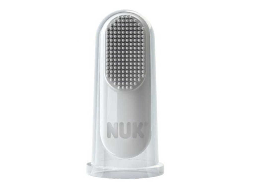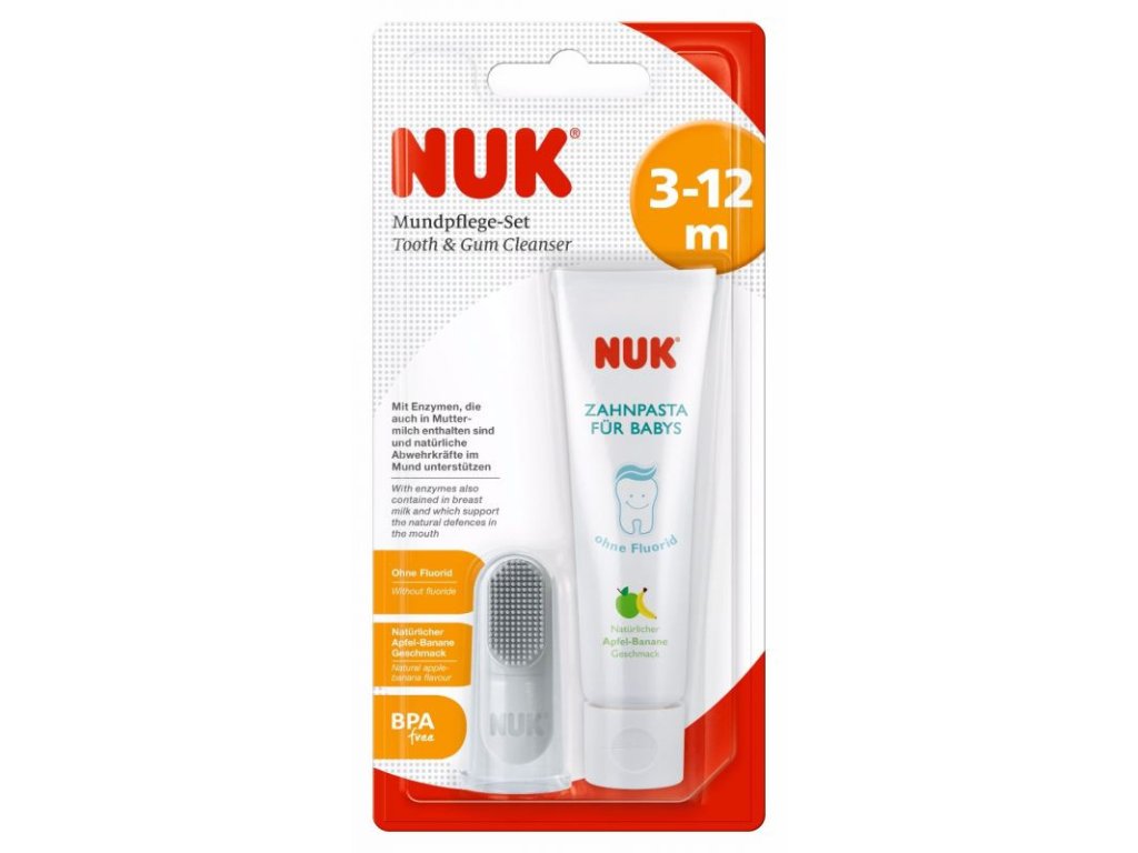 Růst prvních zoubků dokáže znepříjemnit život i jinak klidným miminkům. NUK přichází s šetrnou zubní pastou a masážním náprstkem, díky kterým si toto období společně ulehčíte. Silikonový zubní náprstek s měkkými štětinami je velmi šetrný k citlivým dásním a nedráždí je. Zubní pasta s příchutí jablka a banánu je bez cukru a umělých sladidel. Obsahuje enzymy nacházející se v mateřském mléce, které pomáhají posilovat přirozenou obranyschopnost zubů. Pro děti od 3 měsíců.